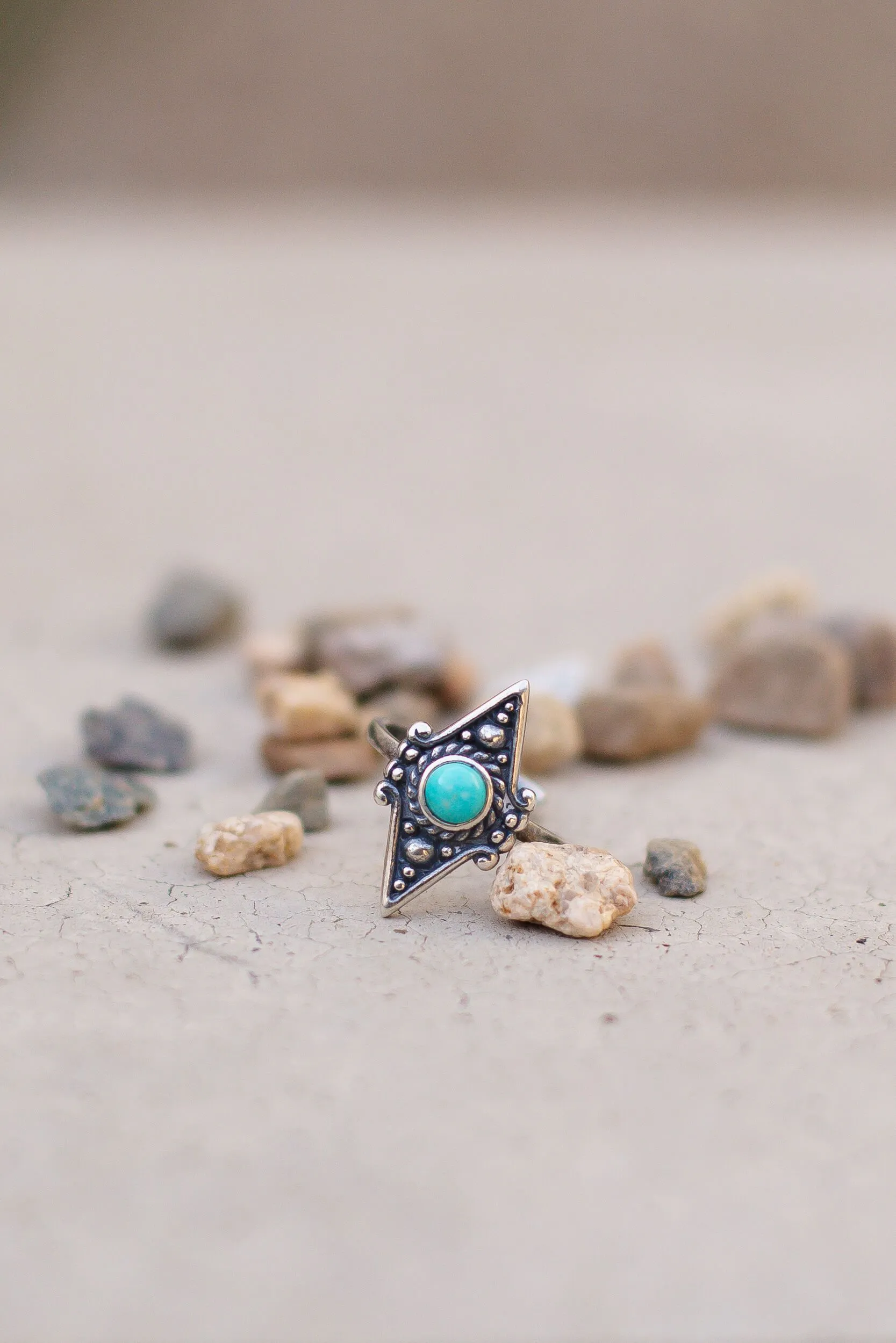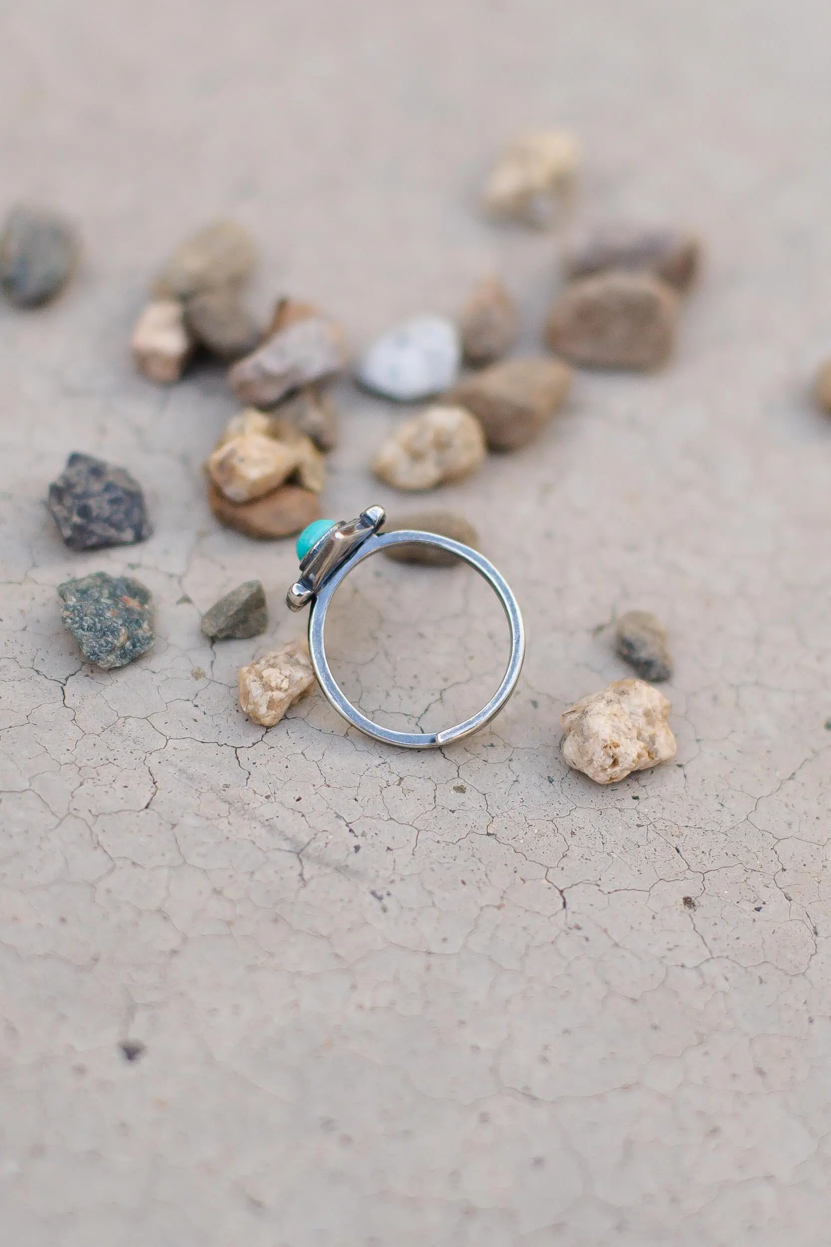 This handcrafted ring from Sowell Jewelry features a beautiful turquoise stone and oxidized sterling silver with an adjustable band.