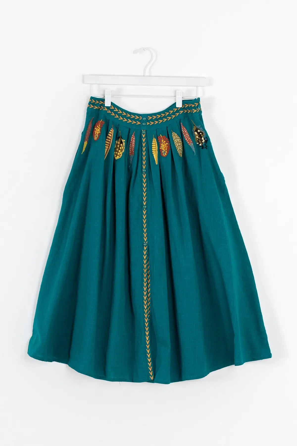Add a pop of color to your wardrobe with our Humberto Skirt. Featuring a bright teal midi skirt with colorful embroidered feathers and details with two pockets, a side zipper and six buttons for the perfect fit. Style with a crop top and your favorite booties to complete this colorful transitional Fall look. Perfect for family gatherings, parties, brunch with friends and running errands.