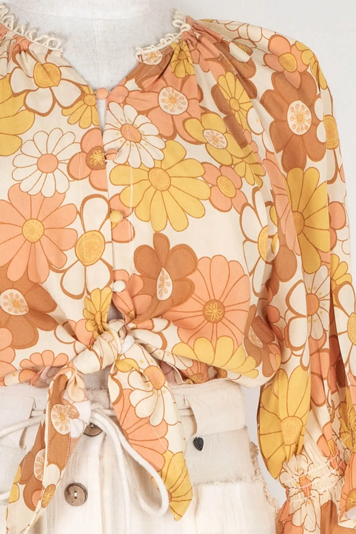 Stay groovy in our Chiquita Top. Featuring a 70’s inspired pink and yellow floral print on light weight fabric with puff sleeves and an adjustable front tie and buttons for the perfect fit. Style with high rise flare jeans and booties to complete this modern day hippie look. Perfect for summer parties, brunch with friends, vacation and running errands.